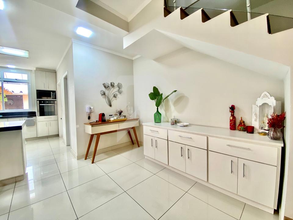 - Na parte inferior, a cozinha é integrada com a sala de TV e jantar, criando um ambiente amplo e acolhedor. Além disso, há um lavabo para maior comodidade dos residentes e visitantes. A cozinha conta com cooktop, forno e exaustor, além de uma despensa e área de serviço, facilitando o dia a dia da família.